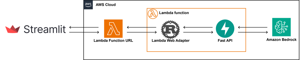 この記事では、Lambda Web Adapterを使ってFastAPIをLambda上で動かし、Amazon Bedrockを使ったLLM(大規模言語モデル)とのチャットアプリをレスポンスストリーミングで作成します。