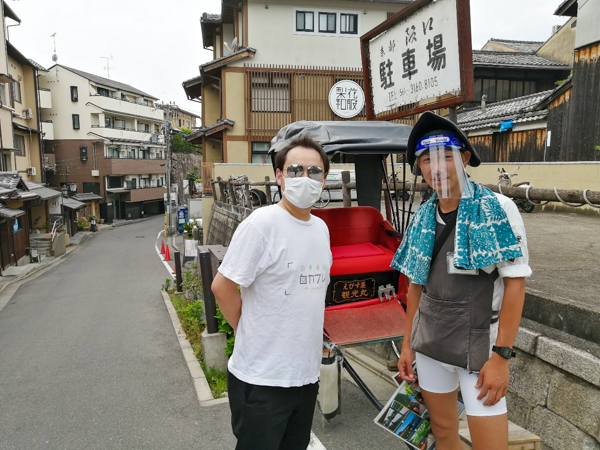 フェイスシールドをしている人力車のお兄さんにも話を伺うことができました。緊急事態宣言が発令されているときは自粛していた人力車の営業ですが、数日前から営業を再開したそうです。