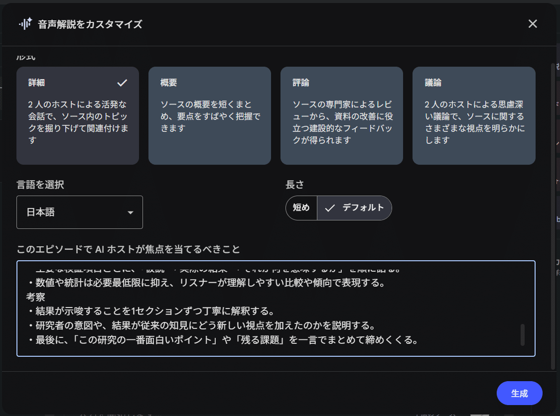 音声解説の生成とカスタマイズ: Studio機能にて「批判的視点を含めて」等の指示を出し、音声生成を開始する(生成時間を考慮し、隙間時間の前に実施)。