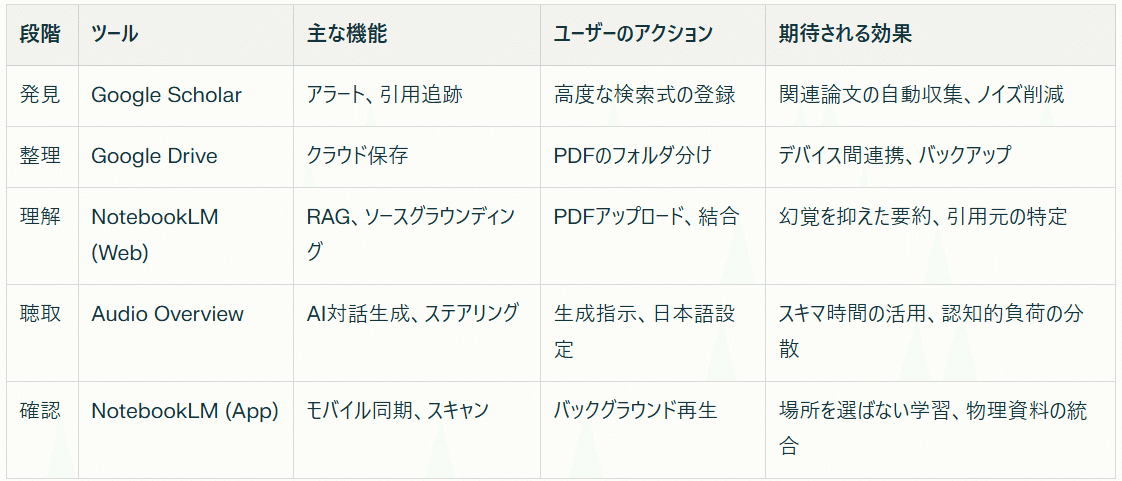 Scholarアラートによる「漏れなき収集」、NotebookLMによる「構造化と音声化」、そしてモバイルアプリによる「場所を選ばない学習」。これらを統合したエコシステムは、研究者の最も希少なリソースである「時間」と「注意力」を最適化する。