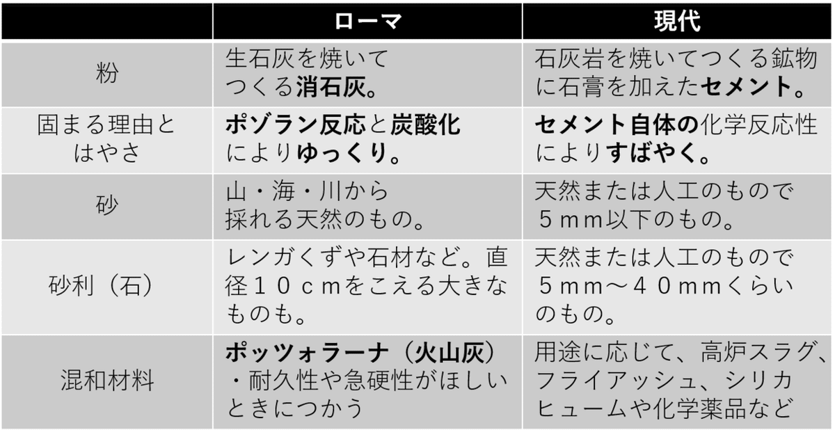 ローマン・コンクリートと現代コンクリートのちがいを、おおざっぱに表にすると以下のような感じです。
