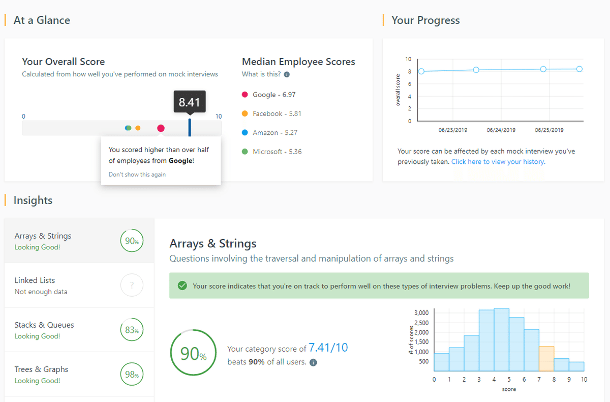 入社試験の過去問が載っているのでちょっとどうかと思うのですが、多くの人が面接対策のために利用しているサイトであり、平等に戦うためには自分も教材として触れておかざるを得ないと思いました。Googleの過去問を解く模擬試験では10段階で8.41という成績であり、Google社員の成績の中央値が6.97だと表示されていたので、コーディングに関してはかなり良い成績なのかなと思いました。LeetCodeの問題は200問くらい解きました。