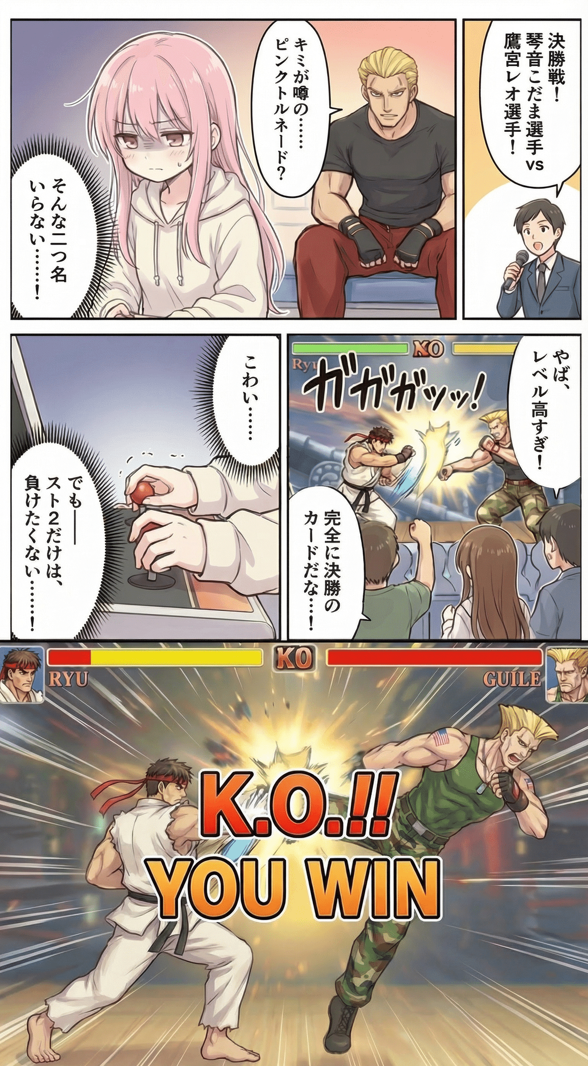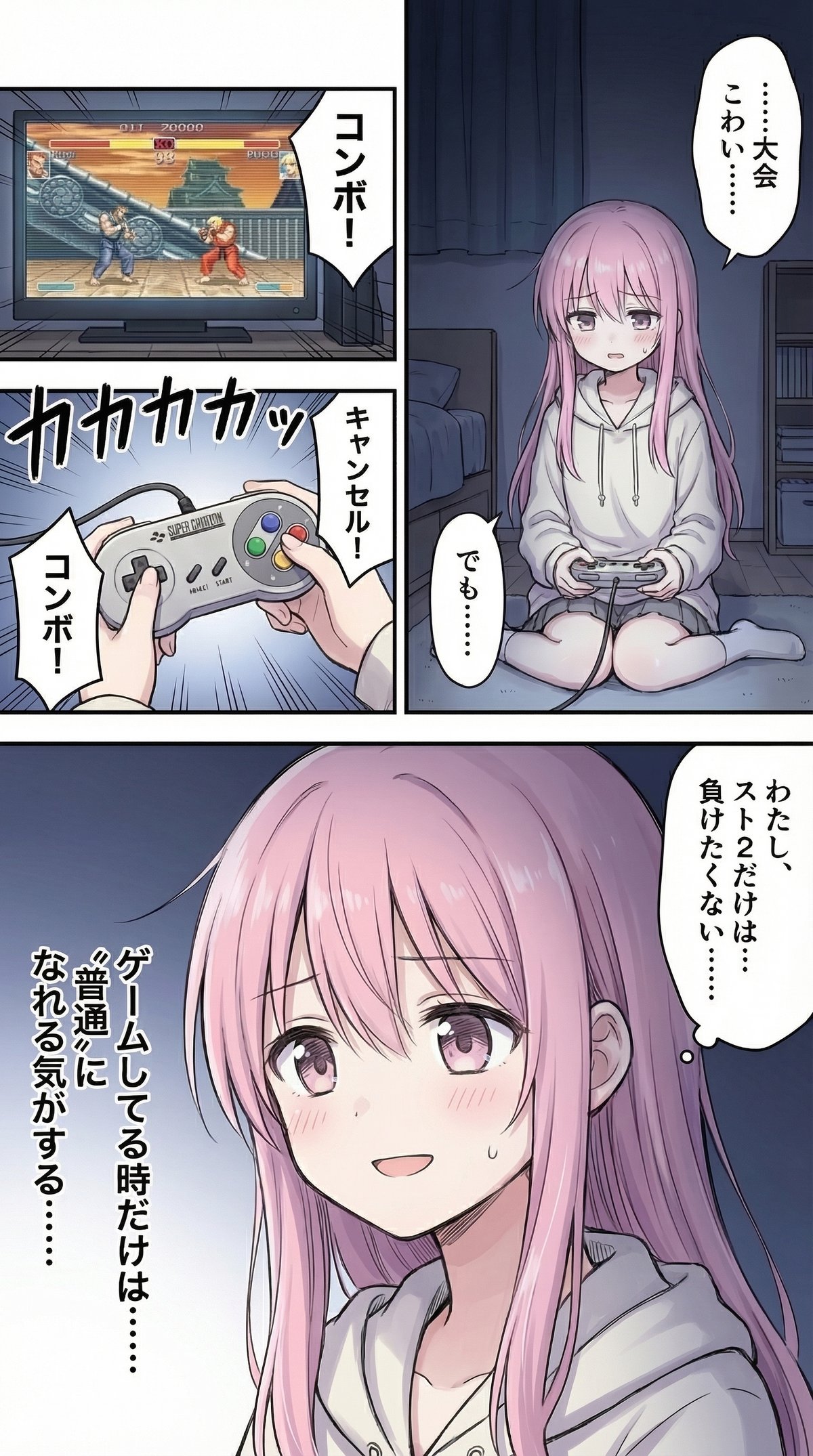 暗い部屋、モニターの光だけ。ジャージ姿でアケコン(またはパッド)を抱えて、無言でスト2をプレイする琴音。