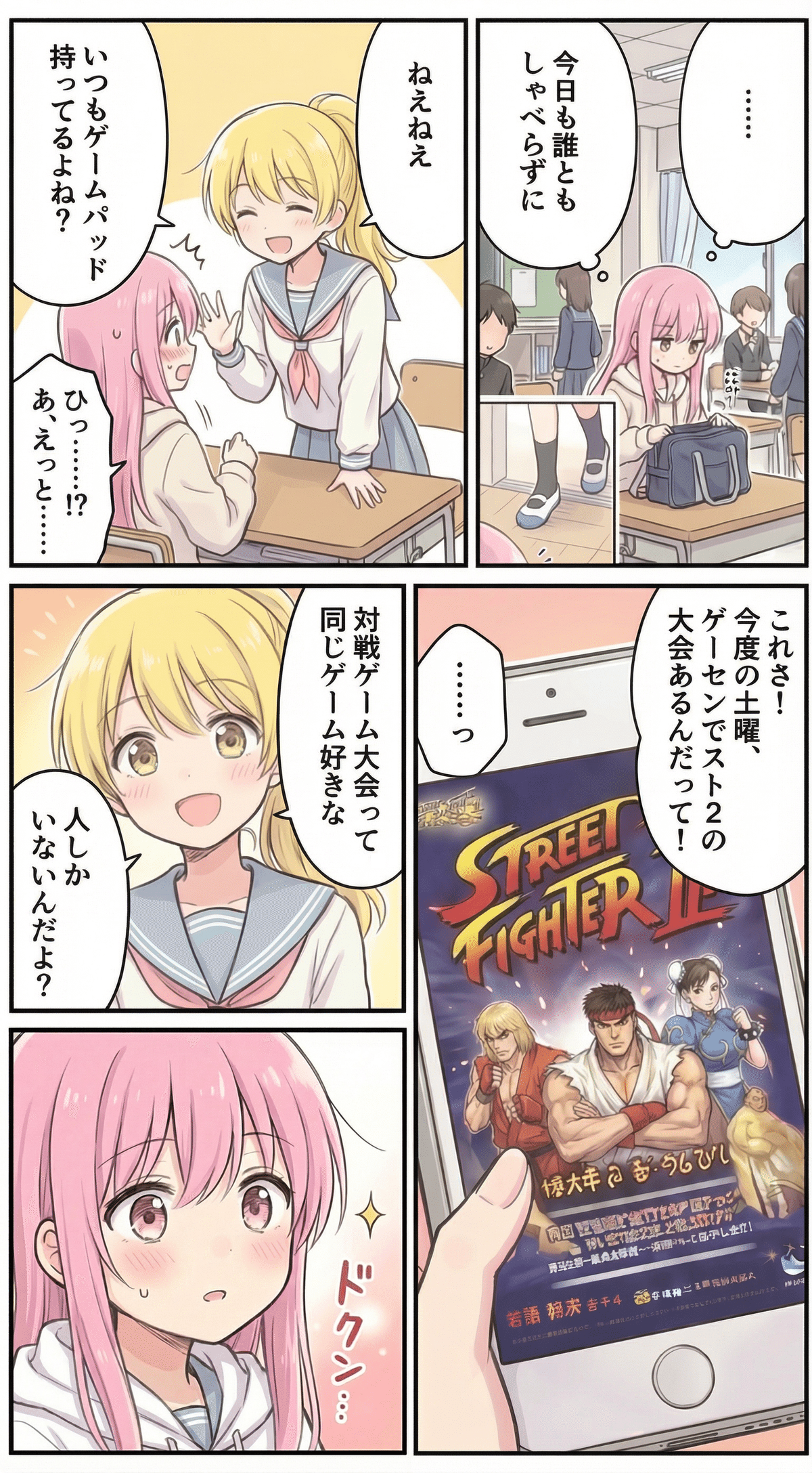 美咲がニコニコしながらスマホ画面を見せる。そこには「ストリートファイター2大会@地元ゲーセン」のポスター。