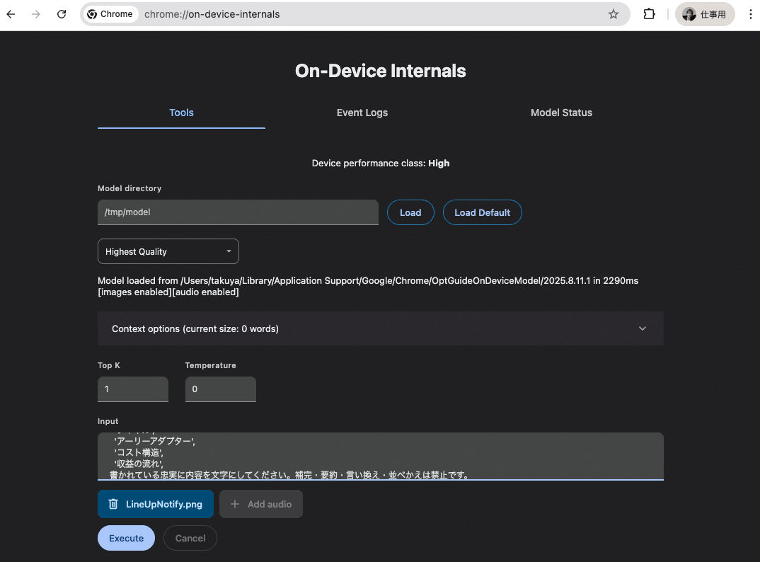 Gemini Nanoの利用可能性を検証するにあたり、Chromeに内蔵されたデバッグページである chrome://on-device-internals を活用しました。このページでは、「オンデバイス AI モデル」(Gemini Nanoなど)の状態を確認できます。