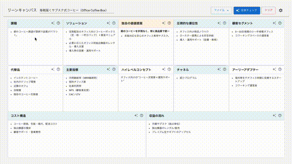 このリーンキャンバスは優れたフレームワークですが、PowerPointやGoogleスライドでキャンバスを用意するのは手間がかかり、また次の問題がありました。