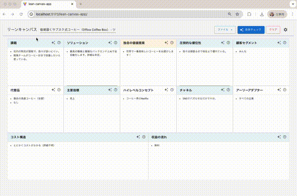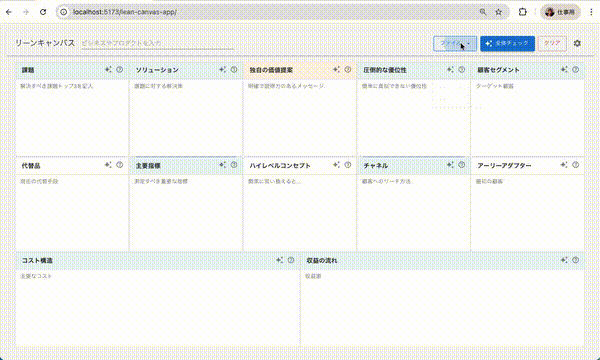 このWebアプリは、リーンキャンバスをブラウザ上で編集し、品質チェック(ルールベース+Gemini Nano)、全体整合性レビュー、そして共有・資料化までを一気通貫で行うためのツールです。「書く」「疑う」「直す」「利用する」を同じ導線で回せるように設計されています。