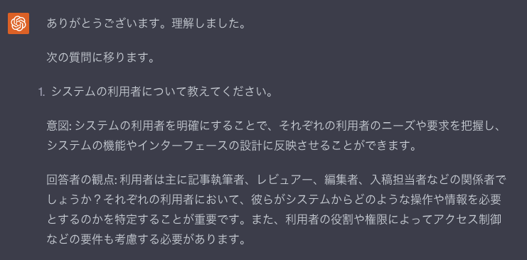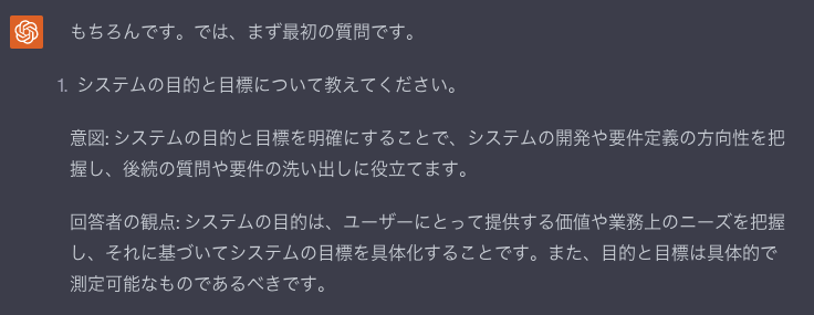 先ほどの目的への回答後にChatGPTから質問が返ってきているので、それに回答する。