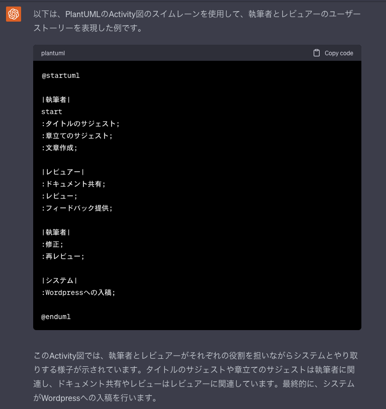 上記のサンプルの記法と一緒に指示を与えることが重要。これがないと、スイムレーンではない回答が返ってくる。