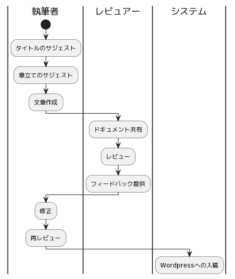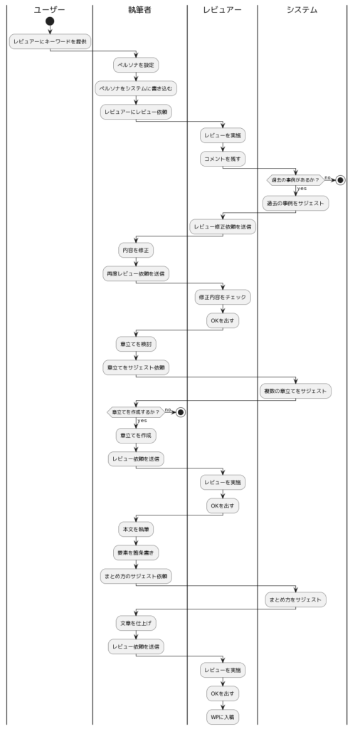 執筆者のユーザーストーリーを以下のように変更したいです。上から時系列で行動が並んでいます。 これをもとに以下を作ってください。 ・PlantUMLのActivity図のスイムレーン ・レビュアーが執筆者にキーワードを提供する ・執筆者はペルソナを設定し、システムに書き込む ・執筆者はレビュアーにレビュー依頼をし、システム上のWebページを共有する ・レビュアーは供されたページを見て、レビューを実施し同一ページにコメントを残す。 ・システムがレビュアーのコメントから、内容を把握し、過去に似たコメントがあれば過去の事例をサジェストする(ナレッジのシェアの目的) ・レビュアーは執筆者に対してシステム上からレビュー修正依頼をお願いする ・執筆者はレビューに基づいて内容を修正する ・執筆者は再度システム上からレビュアーに対してレビュー依頼をする ・レビュアーは修正された内容などの差分をチェックし、OKを出す。 ・執筆者は合意が取れたペルソナをもとに章立てを検討する。 ・執筆者はシステムに対して、ペルソナをもとに章立てをサジェストするように依頼する ・システムは執筆者に対して複数の章立てをサジェストする ・執筆者はその結果をもとにしてもしなくてもよく、章立てを作成する。 ・執筆者はレビュアーにレビュー依頼をシステム上で出す。 ・レビュアーはレビューする。(ここはペルソナ設定時のレビューと同じ展開) ・レビュアーがOKを出す。 ・執筆者は本文を執筆する。 ・執筆者は要素を箇条書きして、本文の上手いまとめかたのサジェストをシステムに依頼する ・システムは箇条書きをもとに、文体をいくつか提示してまとめかたをサジェストする ・執筆者はシステムからの援助をもとに文章を仕上げる。 ・執筆者はレビュアーにレビュー依頼をシステム上で出す。 ・レビュアーはレビューする。(ここはペルソナ設定時のレビューと同じ展開) ・レビュアーがOKを出す。 ・レビュアーはシステムからWPに入稿する。