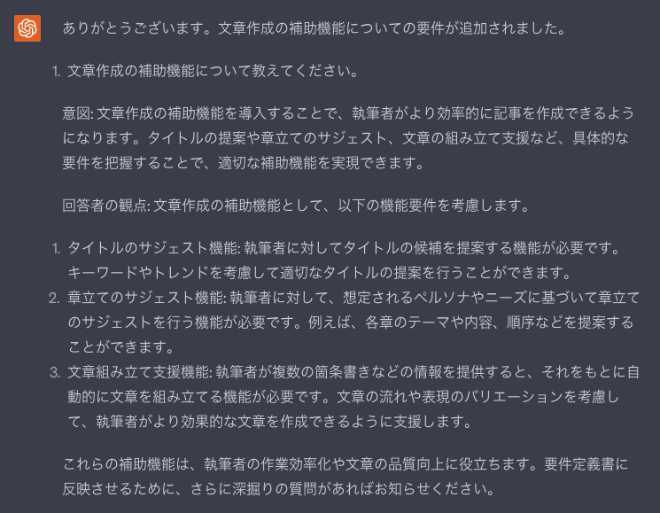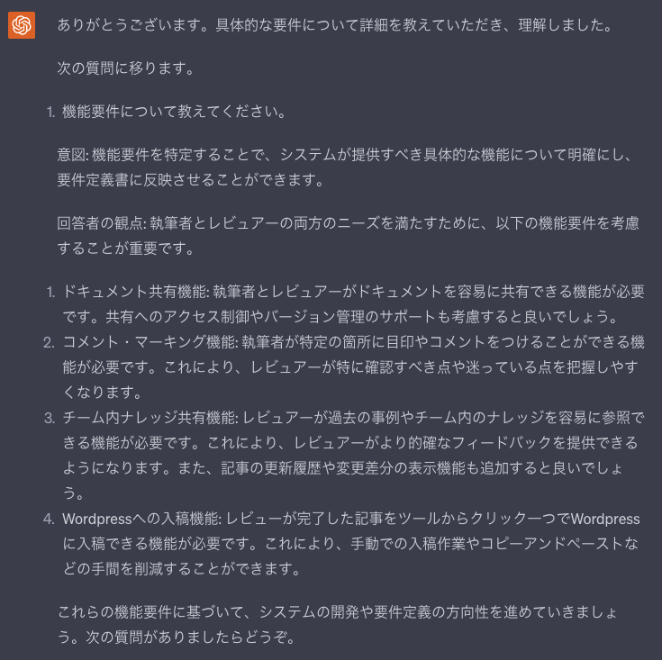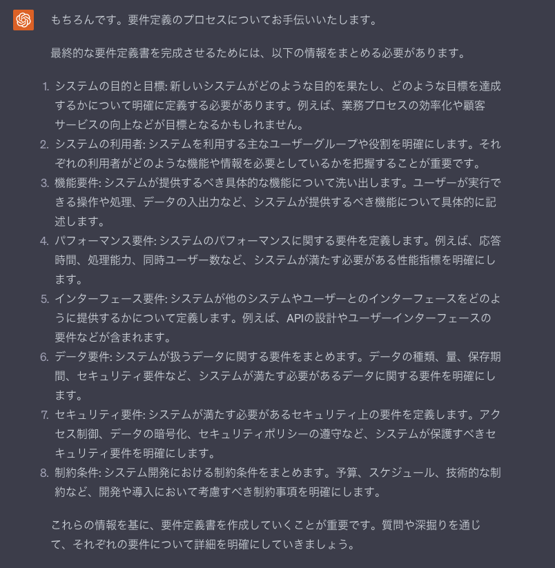 これをしないと、最後に要件定義書のまとまった情報を出力したい時に、ChatGPTのトークン上限に引っかかってしまい以前のやりとりの内容が引き継げないといったことが発生しかねない。
