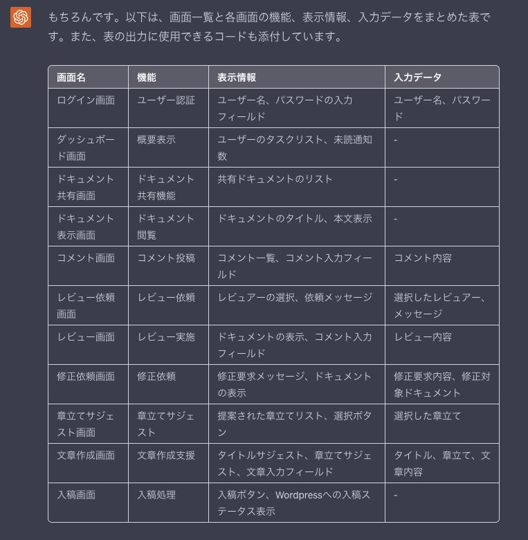 必要な画面一覧と機能、その画面で表示する情報と入力が必要なデータを一つの表にまとめてください。 ChatGPTさんとのやりとりがしやすいように、表の出力もとになるコードも添付してください。