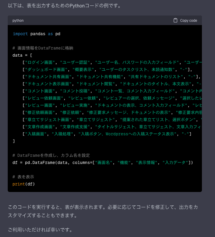 ・もし修正したくなった場合に表を直接いじれるように、表の元になったコードも出力してもらっている。