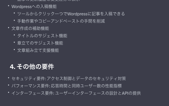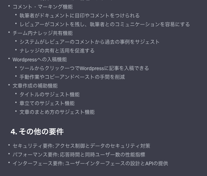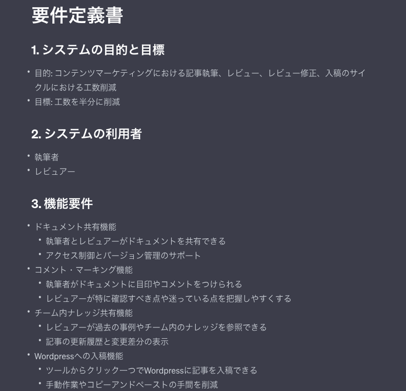 実際に私もchatgptを使って下記のような要件定義書を完成させた。