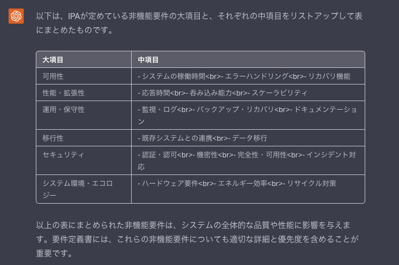 まず、非機能要件の特定の前段階として、IPAが定めている非機能要件をリストアップしてもらっている。