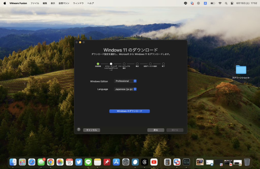 仮想PCを構成したら、そのままアプリ内からWindows11 Proをダウンロードする。