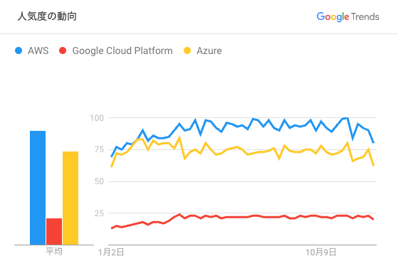 さて、GoogleトレンドでFaaSについて見てみたところ過去1年ではこんな割合で推移しています。AWS Lambdaが飛び抜けてててその構図はほとんど変わらない状態。意外だったのはAzure FunctionsのほうがGoogleのCloud Functionsより検索されていることか。
