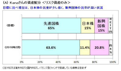 「株式の地域配分は先進国65%で日本と新興国が15%ずつを基本とし、REITが5%の比率です。世界の株式市場の時価総額比が『先進国:日本:新興国で8:1:1』なのを基準にして、新興国と日本の配分を自分の好みで引き上げています。新興国株は現在、比重が目標値を超しており追加購入をしばらく止めています(図A)」