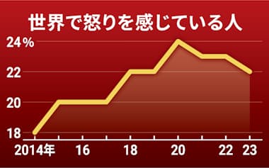 社会や政治などへ憤りを感じる人の割合が世界中で増えている。「自分は怒っている」と答えた人の割合は9年間で2割強上昇した。経済格差や生活不安が背景にあり、極右政党やナショナリズムの台頭につながった。