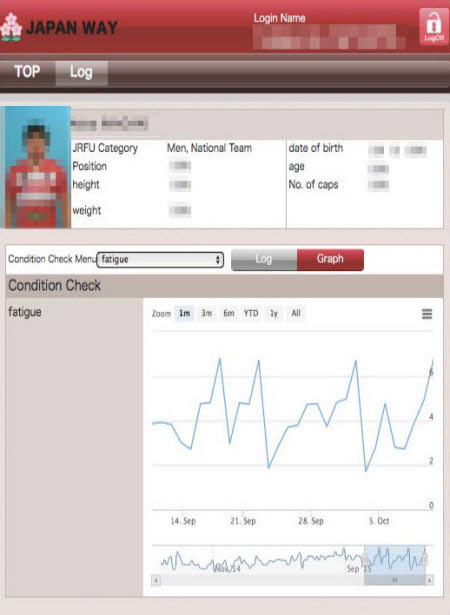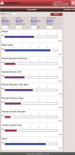 システム稼働後、代表チームは選手に対して朝起きた後など1日1回程度、コンディションに関して主観データを自分のスマホやタブレット端末に入力することを義務づけた。「疲労度」「睡眠の質」「ストレスレベル」「筋肉痛」など、選手個人がその瞬間自分の状態をどう感じているか、各項目について数段階で直感的に答えてもらう。時間に追われる強化の現場を考慮し、スライド式のバーを動かすだけの簡単なユーザーインターフェースを採用。「1回30秒程度で終わる」(橋口パートナー)。