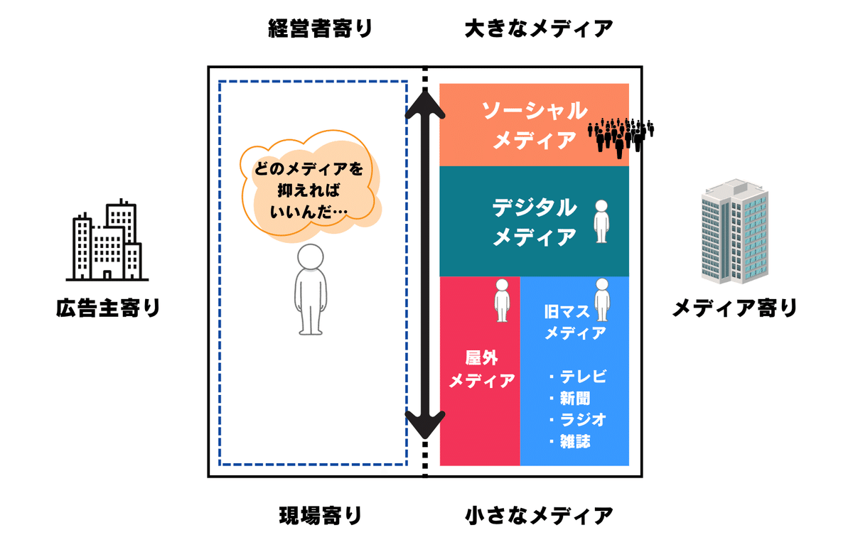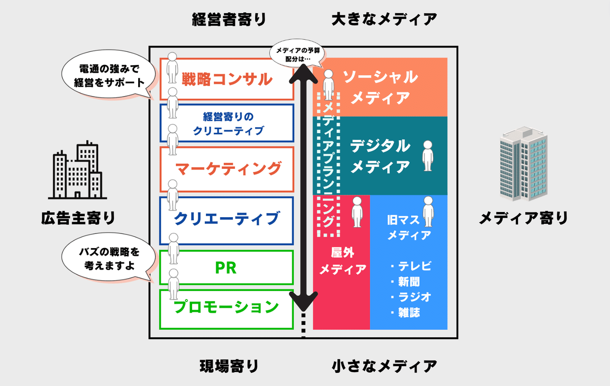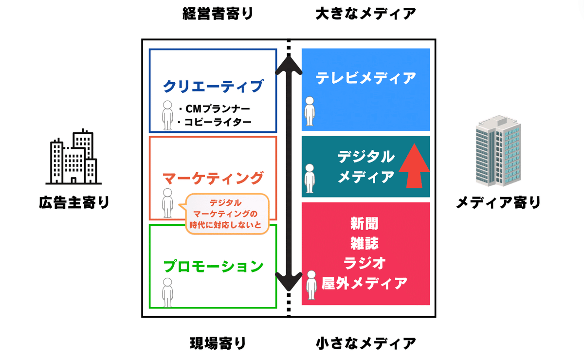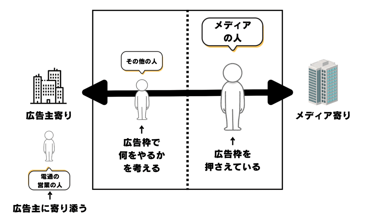 この内勤は大きく2つにわかれる。メディア寄りの仕事をする人と、広告主寄りの仕事をする人だ。