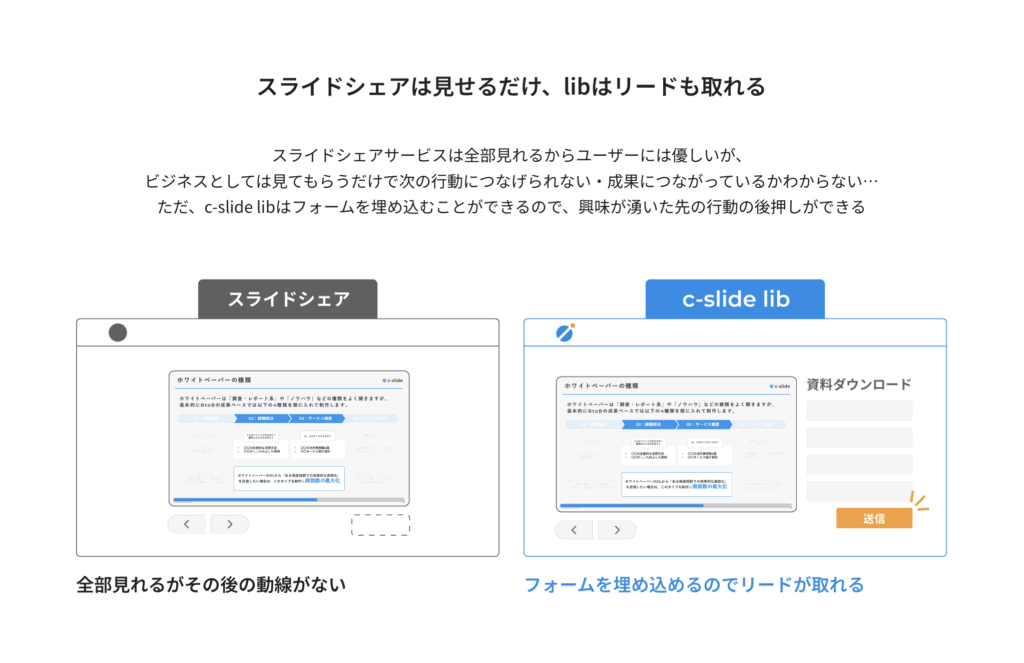 冒頭にもお伝えした通り、c-slide lib(シースライドリブ)は「スライドの横にフォームを埋め込める」スライド共有サービスです。