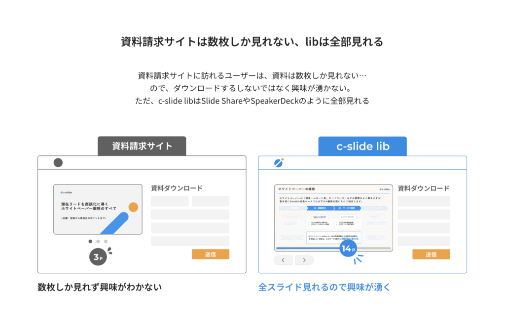 これだけ聞くと「それだけ?」と思うかもしれないけど、実はこれができるサービスは意外と存在しないんです。SlideShareとかSpeakerDeckなどのスライド共有サイトは全ページ公開できるけどCTAが置けない。資料請求サイトはフォーム送信でリードは取れる形式だけど、数ページしか見せられずDLされないとアップしてる意味がない。