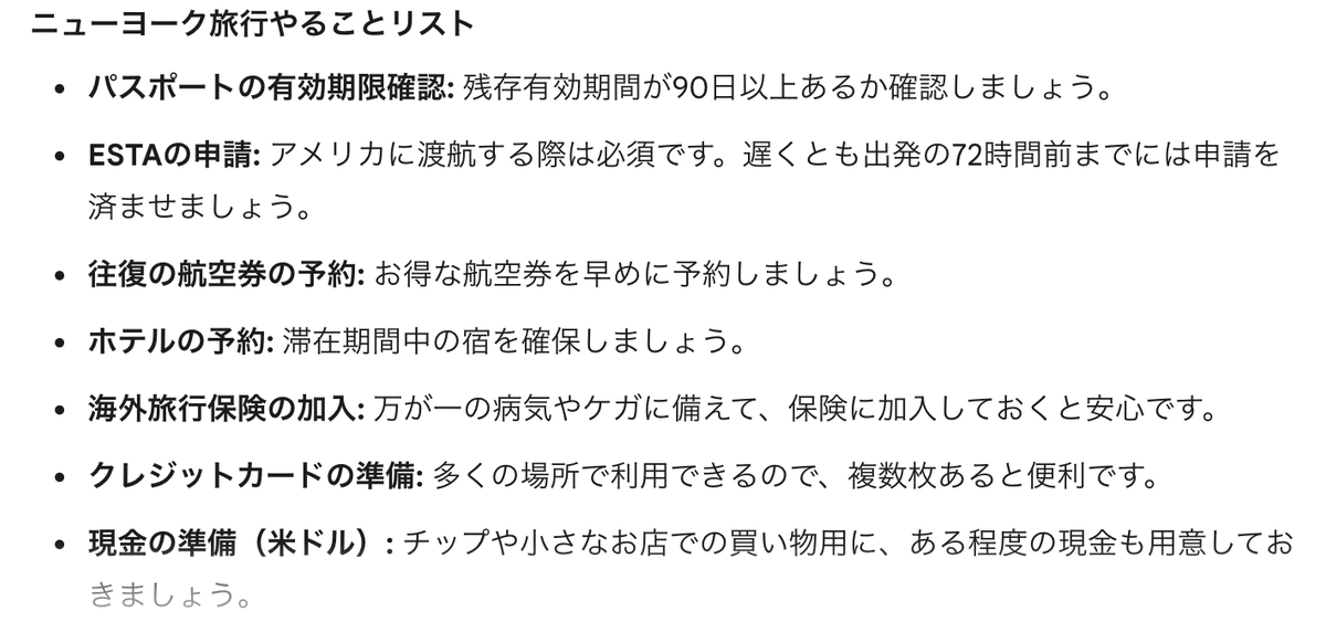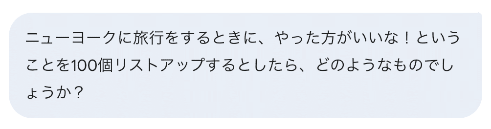 ニューヨークは世界屈指の旅行場所だと思いますが、僕はマジで素人なので、よくわかっていません。なので「やった方がいいなということを100個教えてくれ」とGeminiに聞きました。