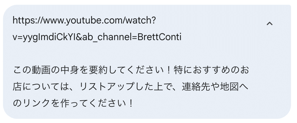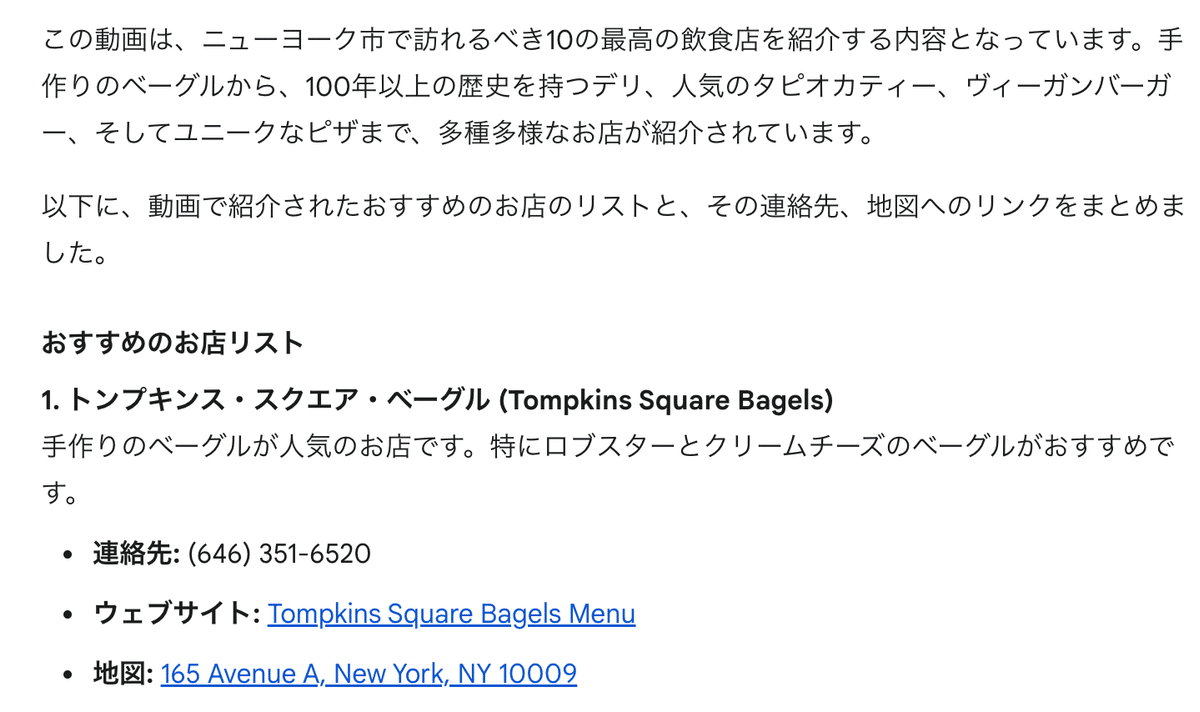 しかし、Geminiを使うと、YouTube動画の中身をめちゃくちゃスムーズに内容を把握できます。例えば「要約してもらって、動画の中のお店をリストアップしてくれ」などの依頼もお手のものです。