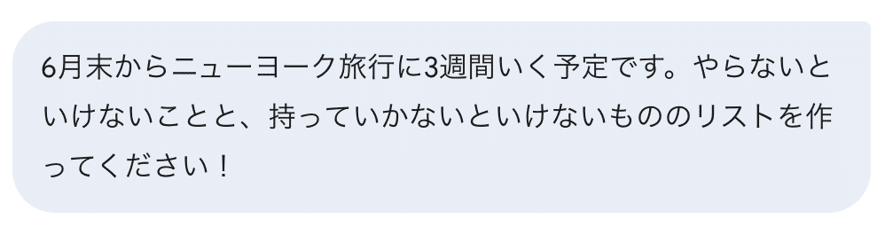 旅行はタスクが多いのですが、この辺りはGeminiの得意分野です。とりあえず「やらないといけないことと、持っていかないといけないもの」というのをリスト化するのが楽です。