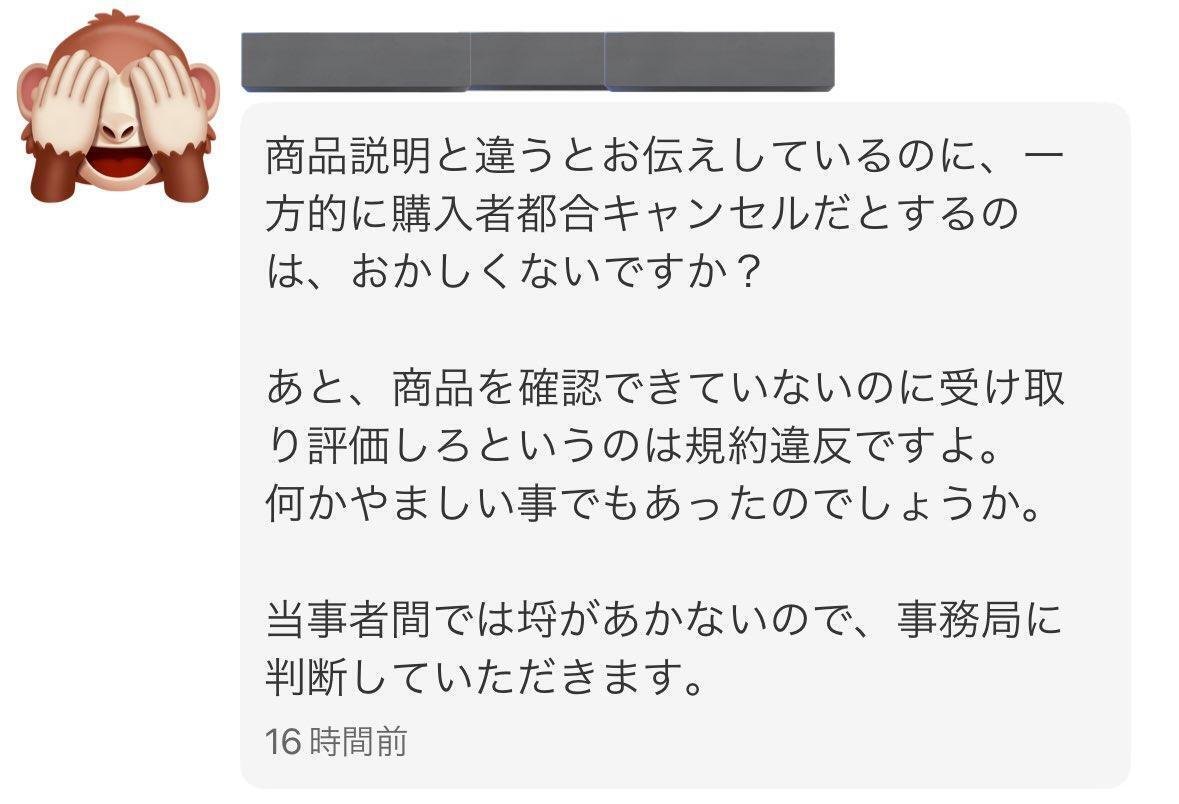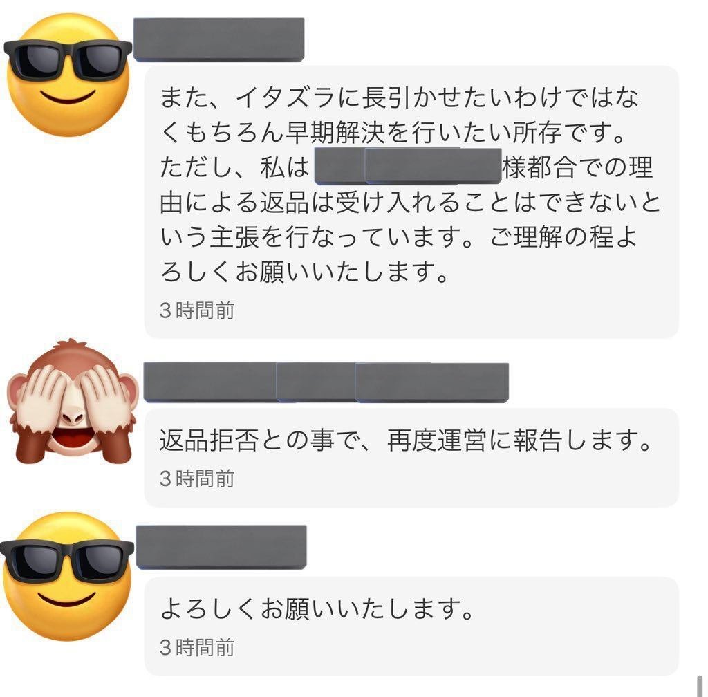 まあ、見事に「おかしい!返品の拒否は受け入れられない!」、「事務局に連絡する!」と発狂したメッセージを送ってきました。