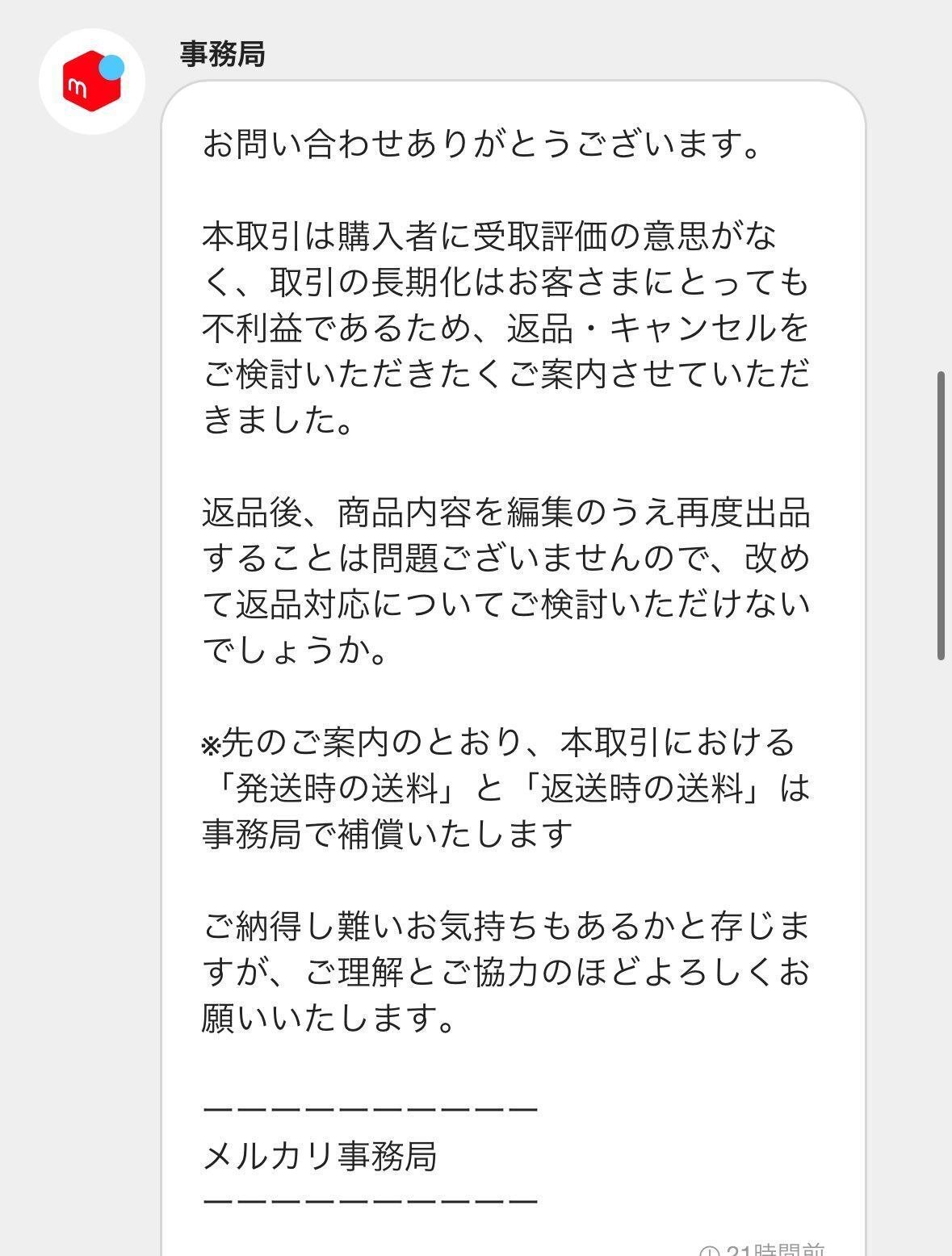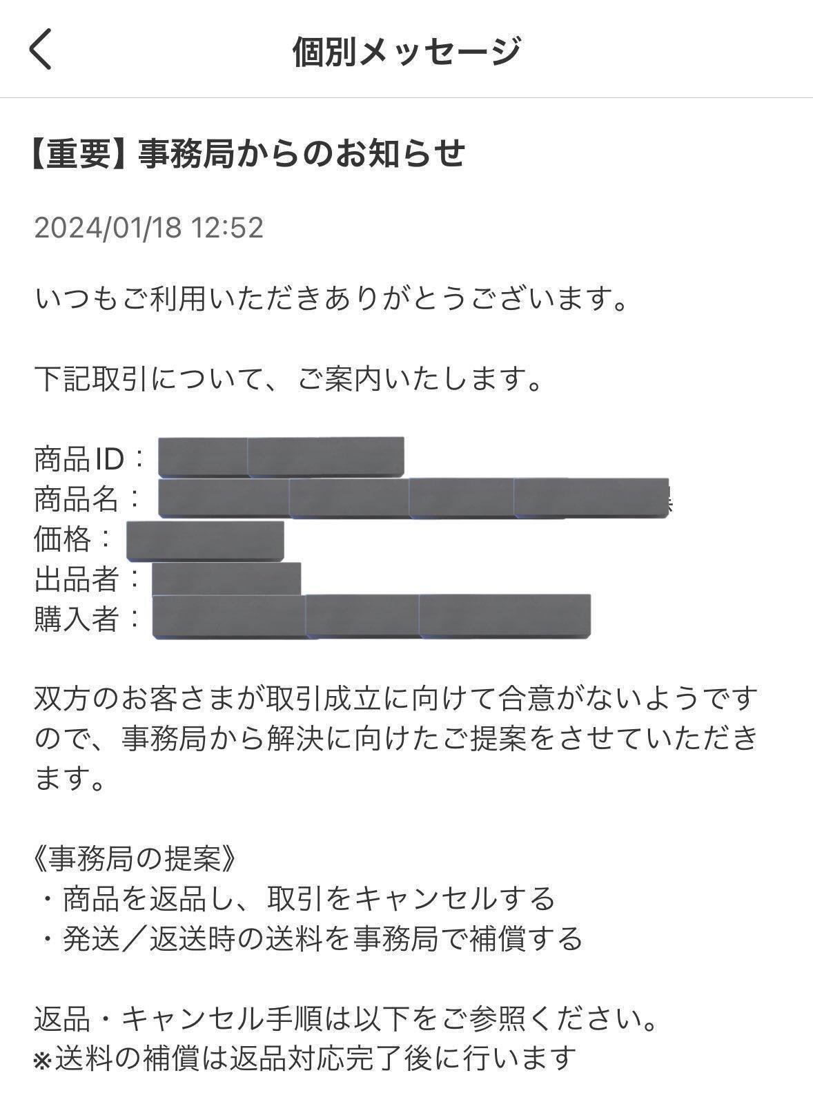 の連絡がありました。つまり、運営事務局は今回の返品を認めず取引の成立を決定したということでした。転売ヤーに勝利です。