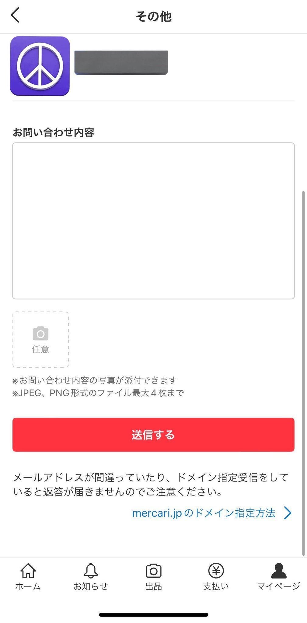 マイページ -> "ガイド・お問い合わせ"の"お問い合わせ" -> "読んでも解決しないのでお問い合わせをする”の”お問い合わせ項目を選ぶ” -> "お問い合わせ項目"の"取引中の商品について"-> "お問い合わせする商品を選ぶ"から出品した商品を選ぶ -> ”その他” -> "上記で解決しない場合"の"お問い合わせをする"