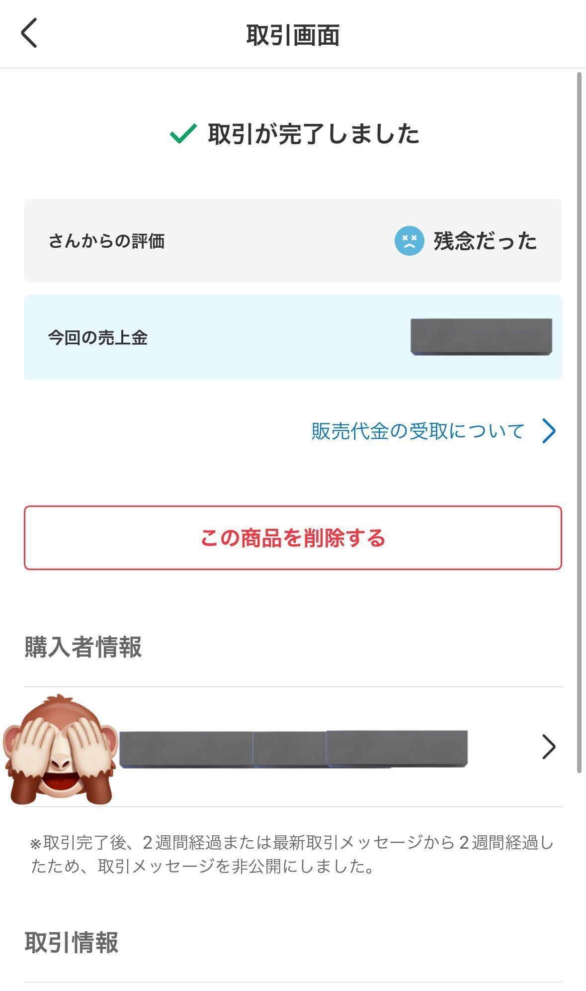 メルカリはこういう形で取引が成立するとすぐに非公開になってしまうのでもう見ることが出来ません。