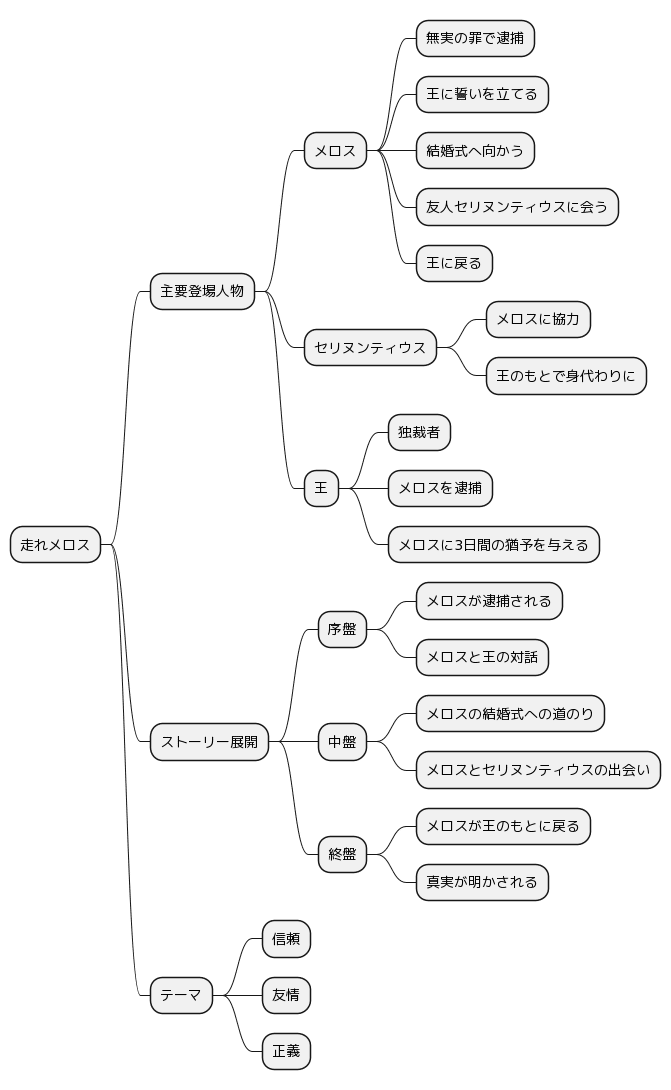 太宰治の走れメロスのストーリーについてマインドマップにまとめて、PlantUMLで出力してください。出力結果