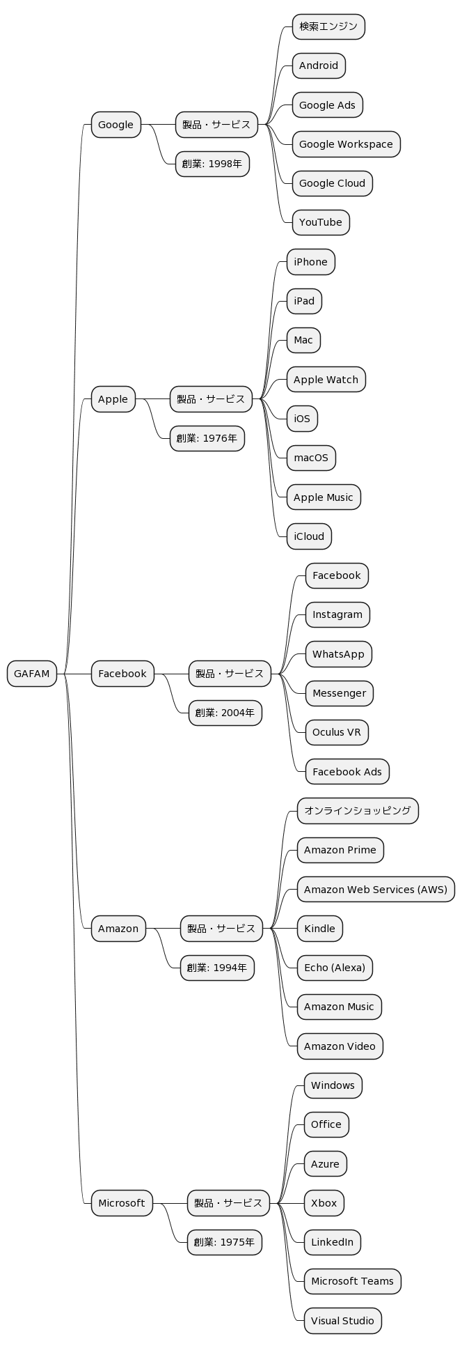 GAFAMについてマインドマップにまとめて、PlantUMLで出力してください。