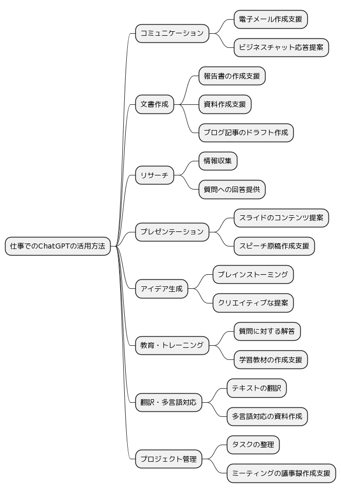 仕事でのChatGPTの活用方法ついてマインドマップにまとめて、PlantUMLで出力してください。