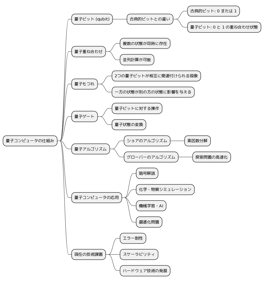 量子コンピュータの仕組みついてマインドマップにまとめて、PlantUMLで出力してください。