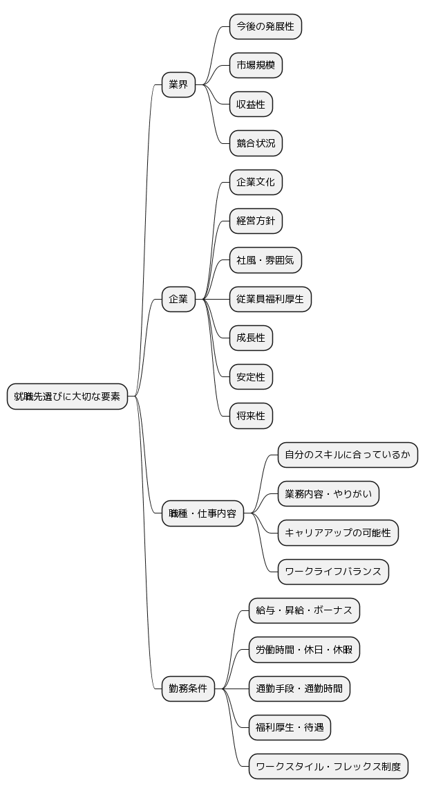 就職先選びに大切な要素についてツリー構造にまとめてマインドマップ風にPlantUMLで出力してください。