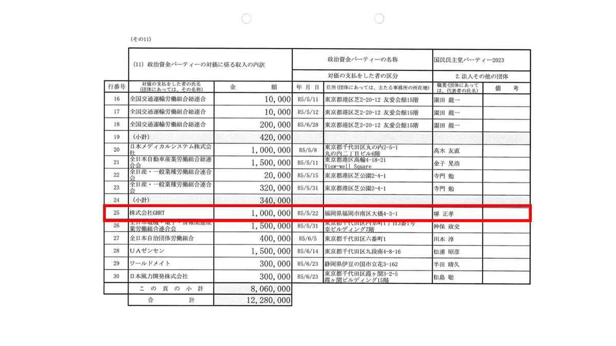 国民民主党の政治資金パーティーに献金した株式会社GHRT(GHRT社)は、福岡県福岡市に本社を置く企業だが、登記以外の情報がほとんど出てこない。