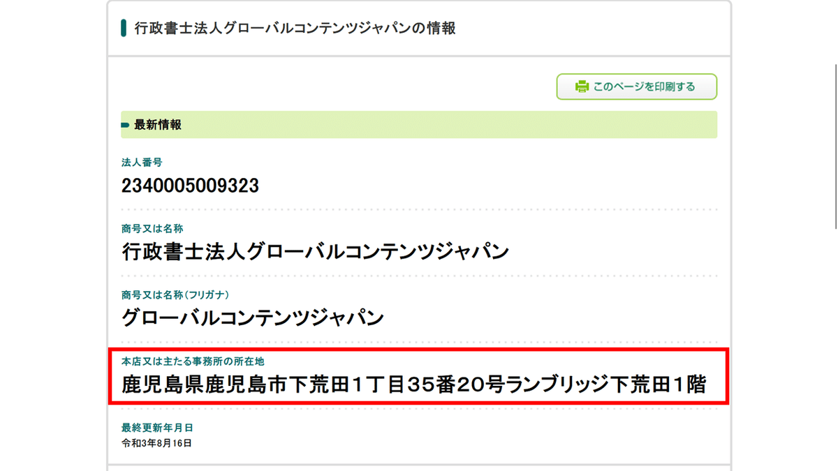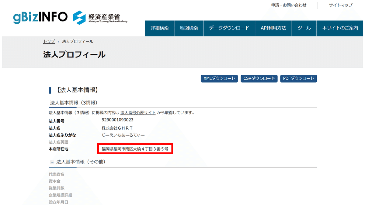 gBizINFOのページには、法人番号、法人名、本店所在地といった法人基本情報が載っている。