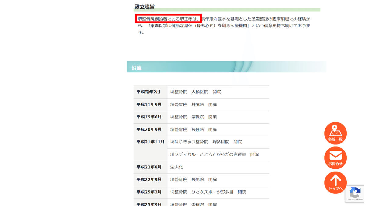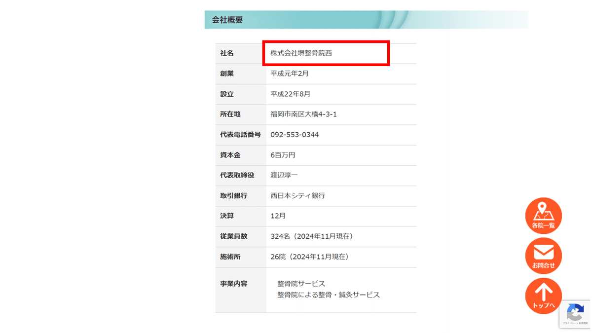 会社概要を見ると、「堺整骨院グループ」の運営会社の名称が、「株式会社堺整骨院西」となっている。