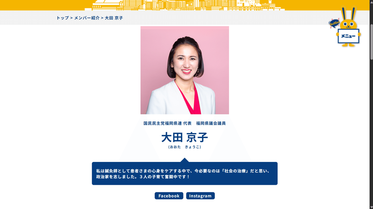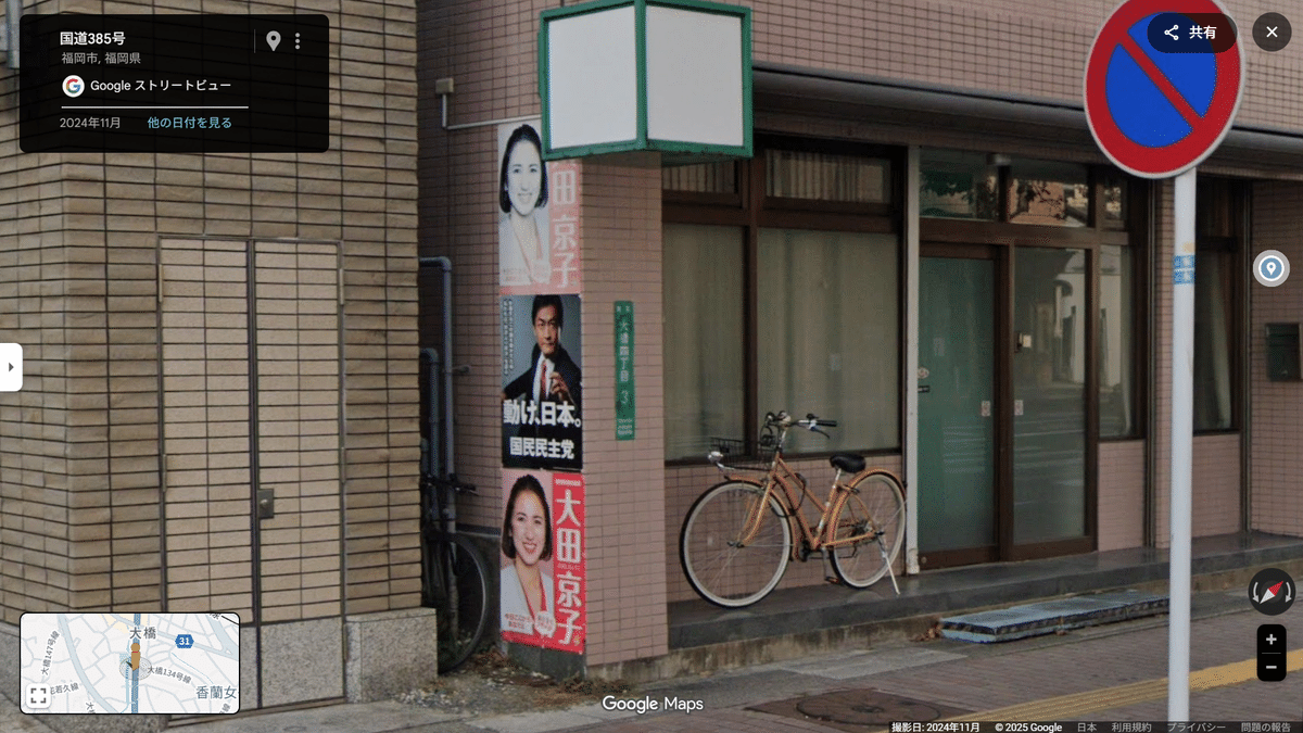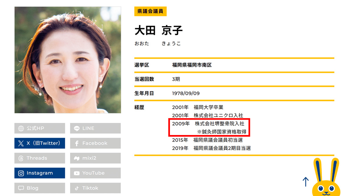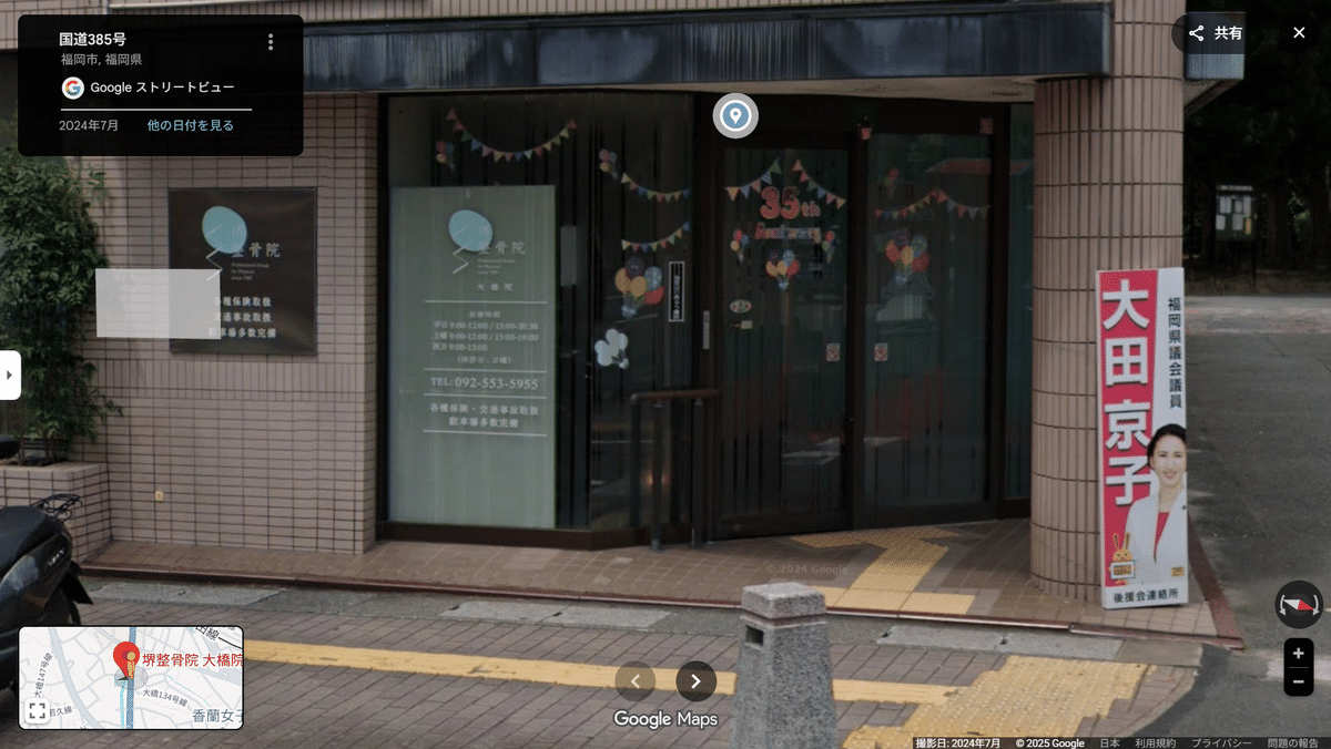 ただ、Googleストリートビューに切り替えると、あのウサギがいた。この接骨院は、国民民主党福岡県連の代表も務める、大田 京子 県議会議員の後援会の連絡所となっているようである。