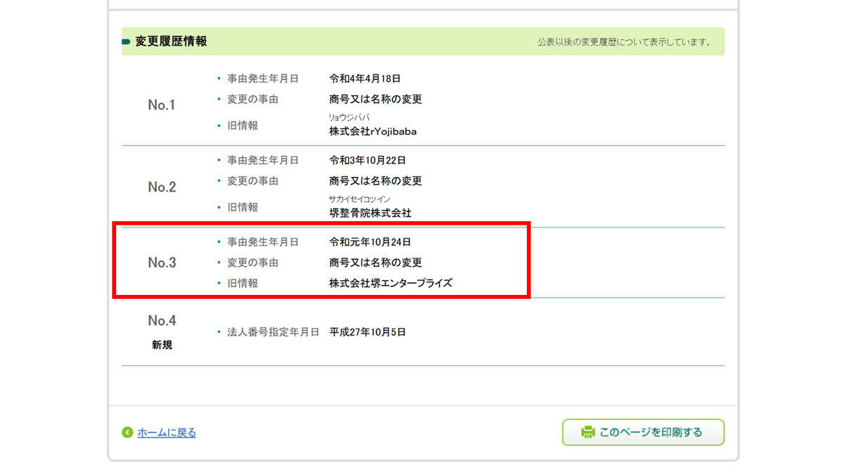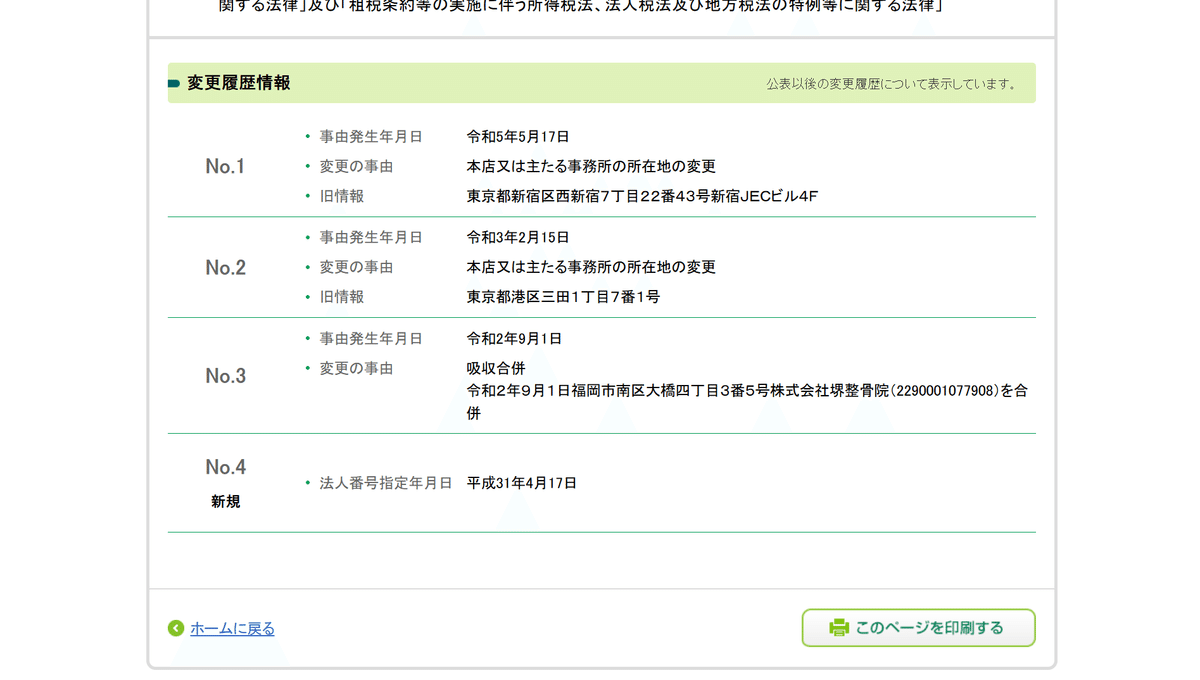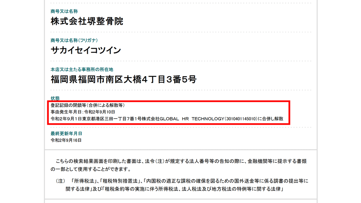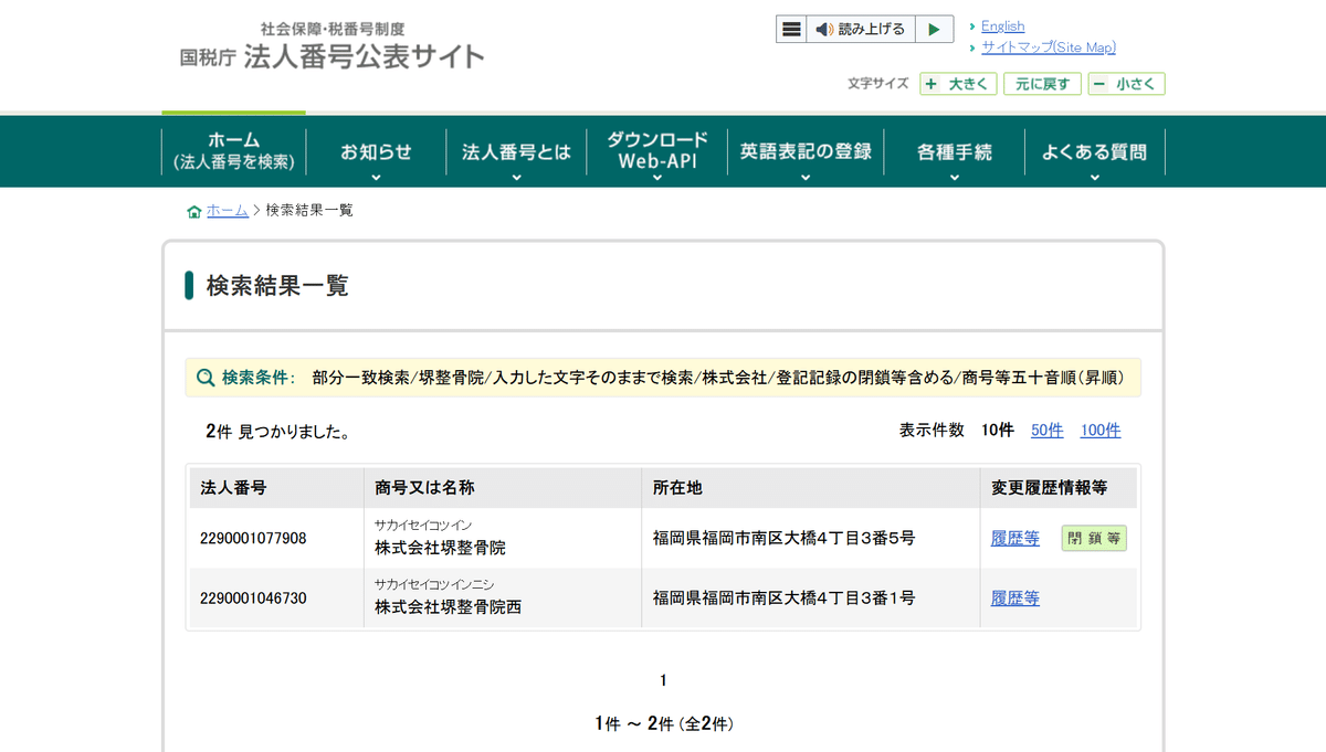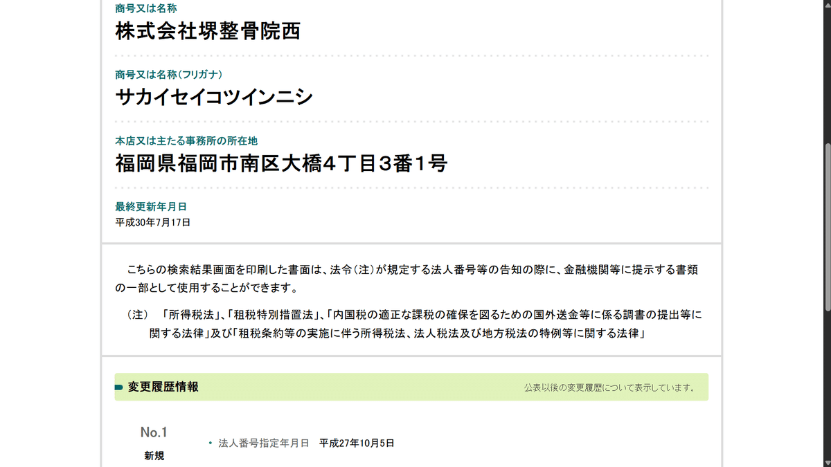 「西」の存在が気になって、夜しか眠れなくなった私は、法人基本情報の変更履歴を確認することができる国税庁の「法人番号公表サイト」で、「株式会社堺整骨院」と検索した。