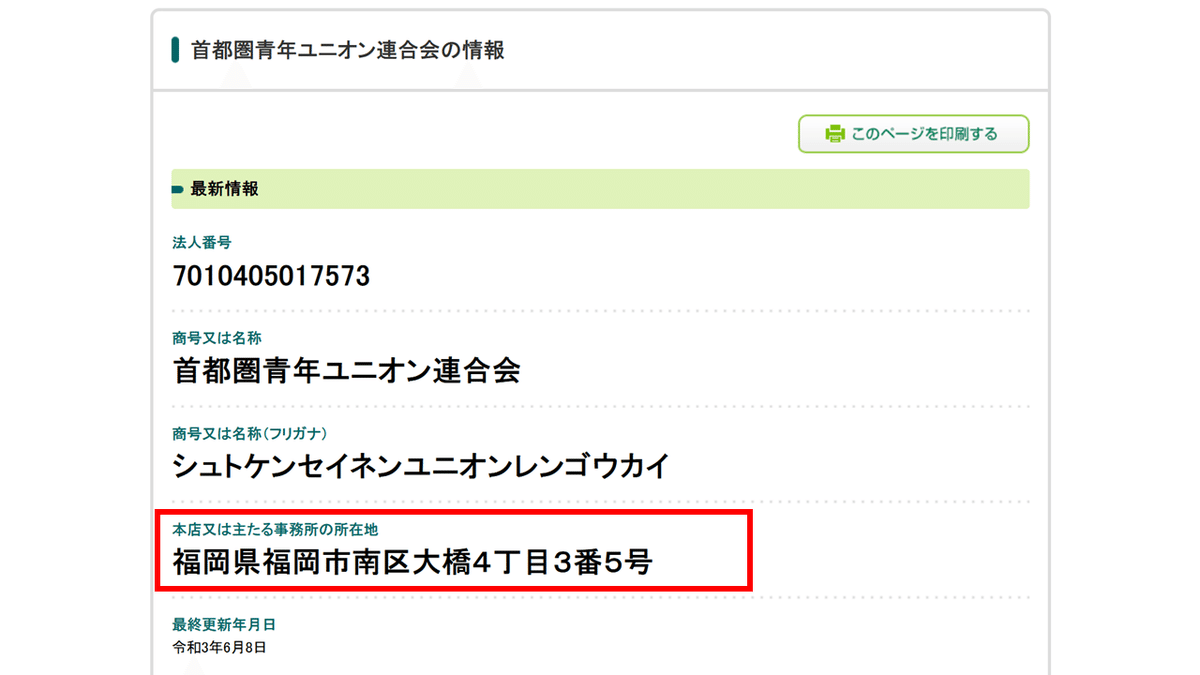 法人基本情報の所在地は「福岡県福岡市南区大橋4丁目3番5号」であるのに対し、収支報告書では、「福岡県福岡市南区大橋4丁目3番1号」となっているのだ。