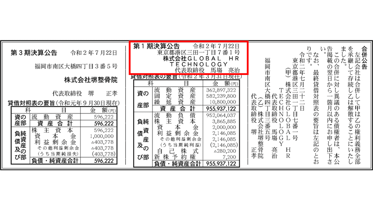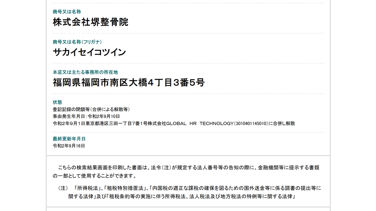 なんと、堺整骨院社は、「株式会社GLOBAL HR TECHNOLOGY」(以下「GLO-TECH社」)に吸収合併されていたのだ。