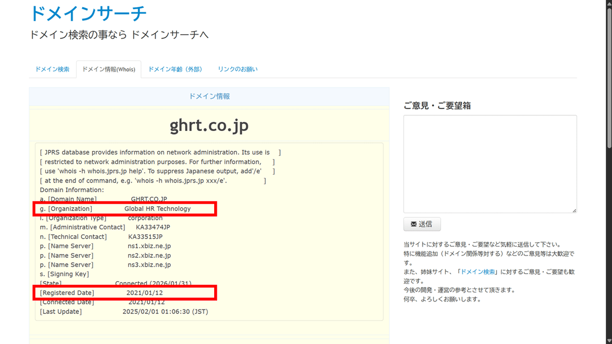 ドメインサーチというサイトで、「GHTR」の文字列を含む、「NIKKEI COMPASS」において、GLO-TECH社のものとされていたドメイン(ghrt.co.jp)のWHOIS情報(ドメイン所有者に関する情報)を調べた。
