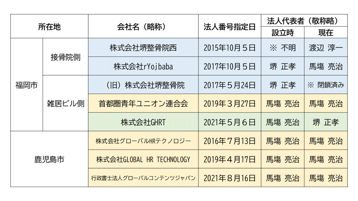 また、唯一の例外が、 馬塲 氏がはじめから福岡市で設立し、堺 氏 が引き継いだ、GHRT社(緑色網掛け)である。