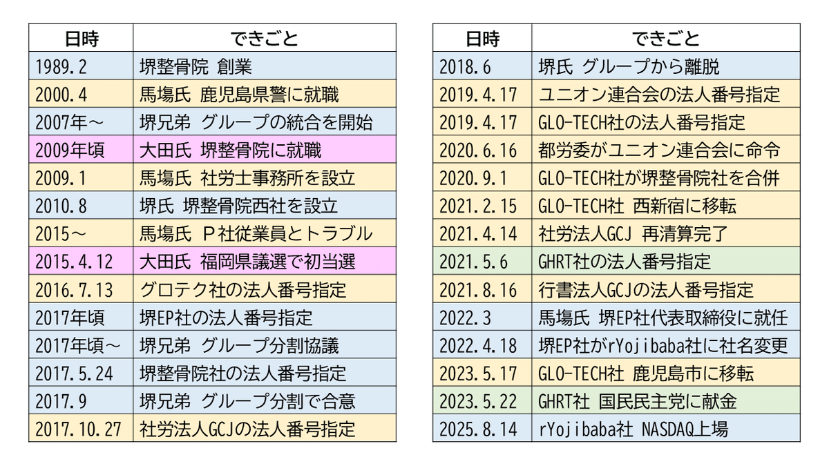なお、年表は、堺 氏に関係する事柄は黄色網掛け、馬塲 氏に関係する事柄は青色網掛け、GHRT社に関する事項は緑色網掛け、大田 議員に関係する事柄はピンク色網掛けで、それぞれ色分けしました。