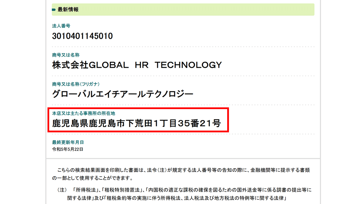 株式会社GLOBAL HR TECHNOLOGYは、東京都内で設立されたが、株式会社堺整骨院を吸収合併した後に、最終的に、本社所在地を鹿児島市のアパートに移転した。